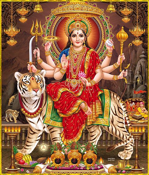 Wenn die männlichen Kräfte nicht mehr weiter wissen, oder sich nicht weiter trauen, tritt Durga auf als der Archetyp der weiblichen Kraft, die die Geschöpfe aus Gefahren rettet und das Unheil in Schranken weist. Sie wird auf einem Tiger reitend dargestellt mit zahllosen Armen, in denen sie die Waffen der männlichen Götter hält.